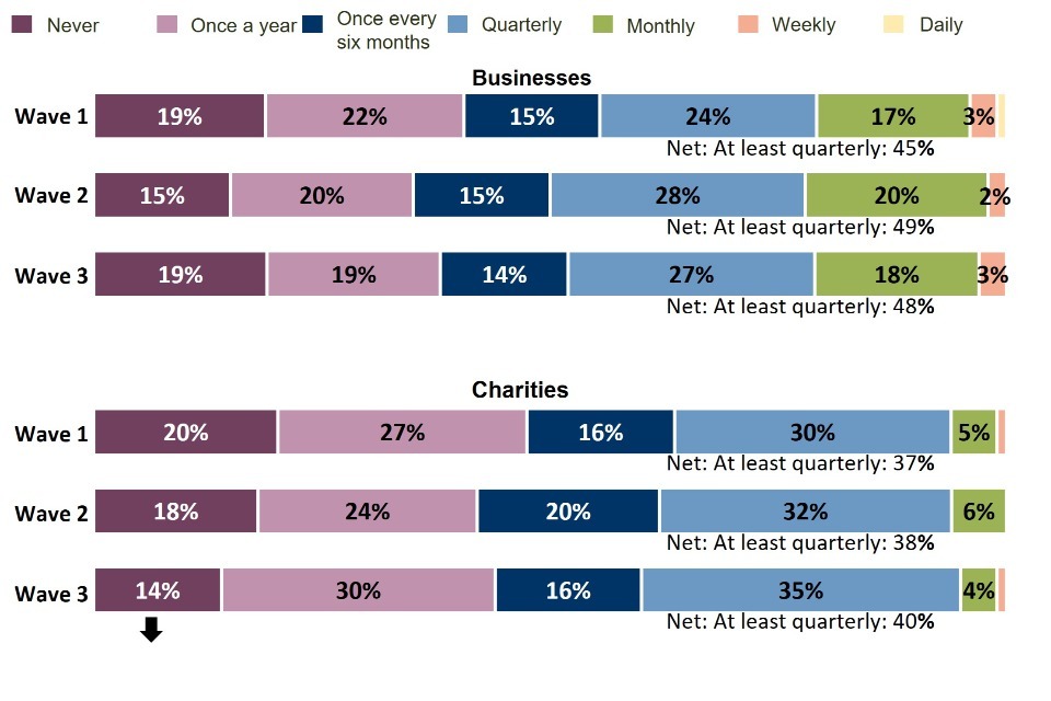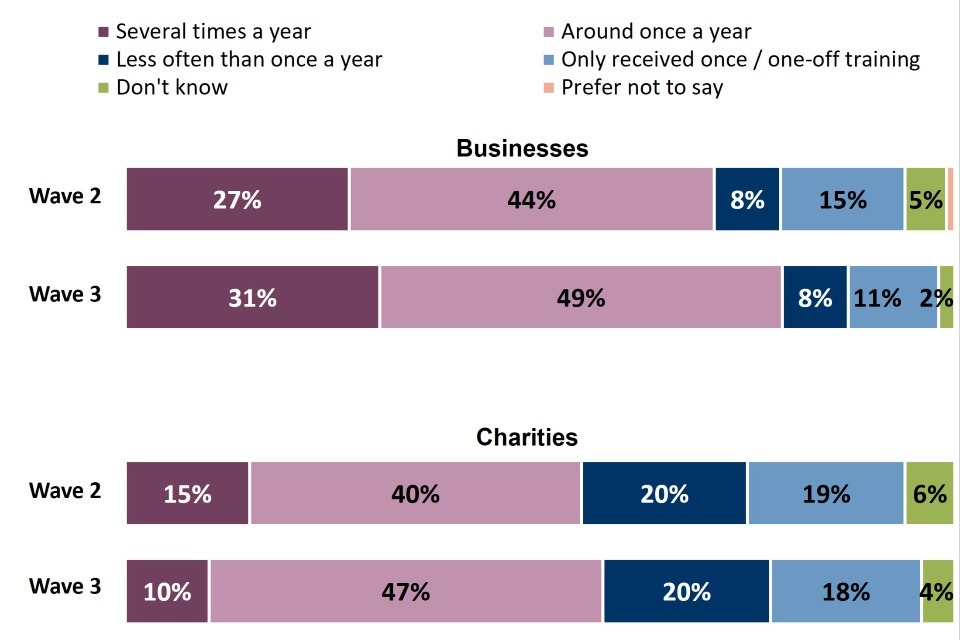 Further to this, board-level cyber security training has increased for both businesses (50% in Wave Three compared to 35% in Wave One) and charities (38% in Wave Three compared to 28% in Wave One) but has remained consistent between Wave Two and Three. This training is most likely to be completed once a year, although for around one-third (31%) of businesses this board-level training happens several times a year.