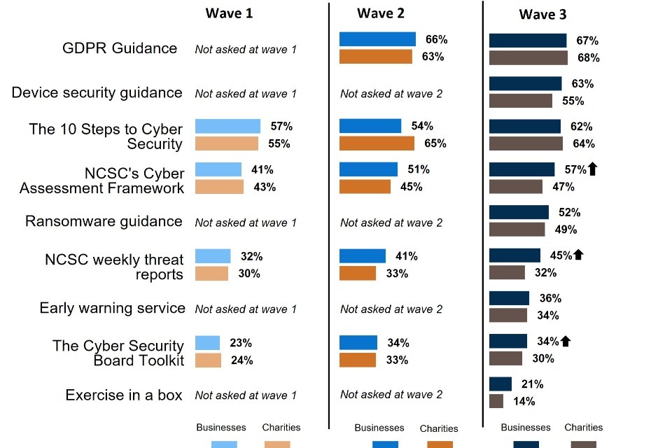 In addition to this, among businesses, there has been an increase in usage of the Cyber Assessment Framework (57% in Wave Three vs. 41% in Wave One), NCSC weekly threat reports (45% vs. 32%), and Cyber Security Board Toolkit (34% vs. 23%).
