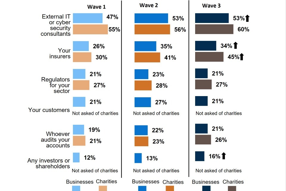 Since Wave One, more businesses (34% in Wave Three vs. 26% in Wave One) and charities (45% vs. 30%) report their actions on cyber security being influenced by their insurers.