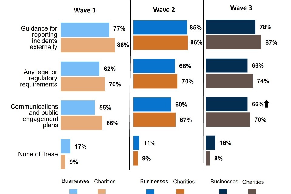 - With regards to incident management processes, a considerable majority of businesses and charities have these in place: guidance for reporting incidents externally (78% of businesses, 87% of charities), legal or regulatory requirements (66% of businesses, 74% of charities), and communications and public engagement plans (66% businesses, 70% charities).
