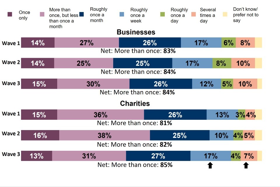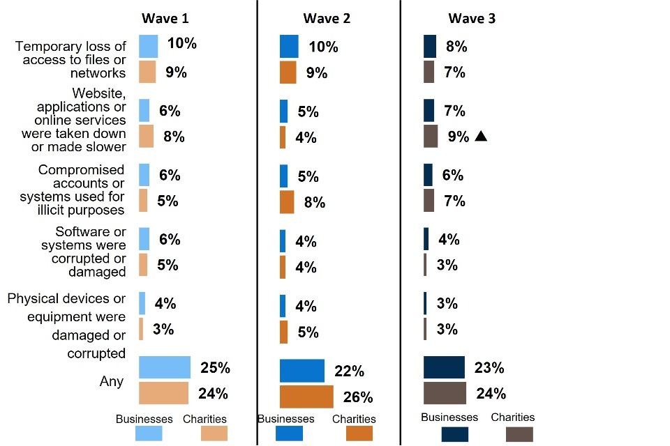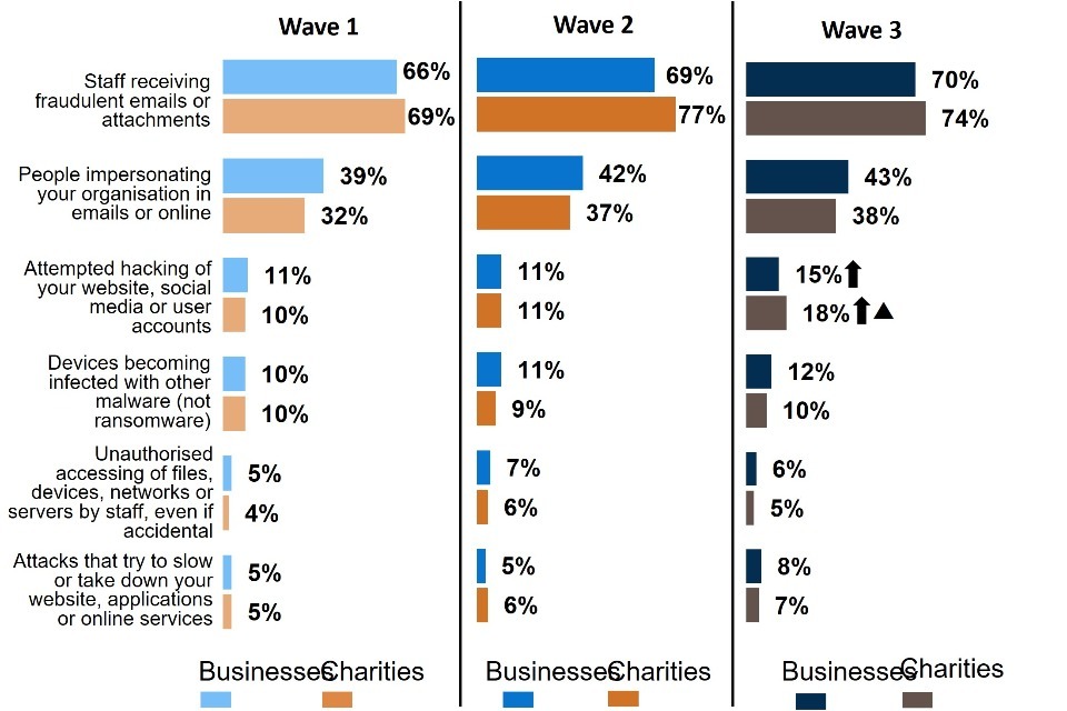 Despite this, the underlying data does show some change between waves. A higher proportion of charities experienced an attempted hacking of their website or social media accounts compared to Wave Two (18%, up from 11%). The equivalent proportion from businesses remained consistent across waves.