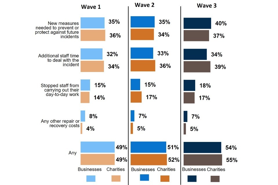 Broadly, organisations reported that most cyber security incidents only rarely cause a material loss (e.g., money or data). Only around one-quarter of businesses (23%) and charities (24%) experiencing incidents in the last year report material consequences. Further to this, most of these losses are short-term. Despite this, it is important to note that cyber incidents still have the potential to cause significant costs for organisations.