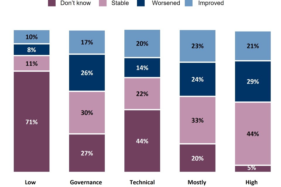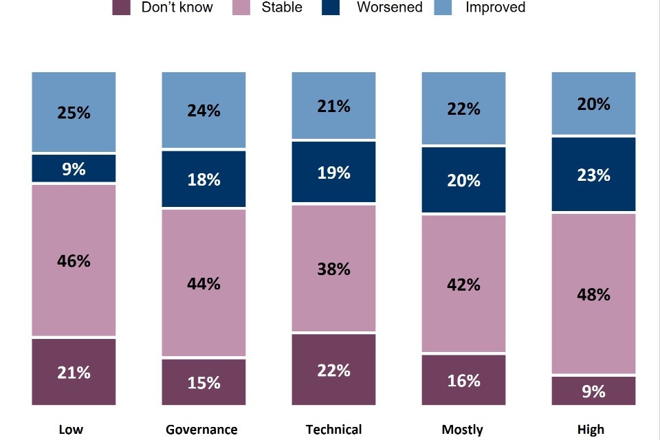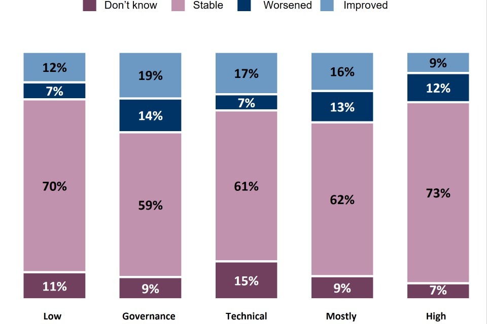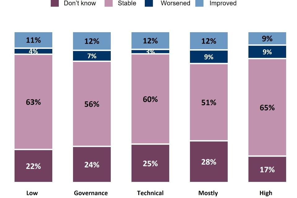 To some extent, these changes may be relatively minor. For example, around one-fifth (21%) of the High group move to Mostly and another fifth from Mostly to High (21%). Additionally, around half (51%) of Low resilience organisations remain Low but the other half improve. This suggests that there is some degree of volatility in cyber resilience levels. Some of this volatility has relatively minor impacts on general levels of resilience, with some organisations showing potentially positive improvements and other organisations reporting lower resilience.