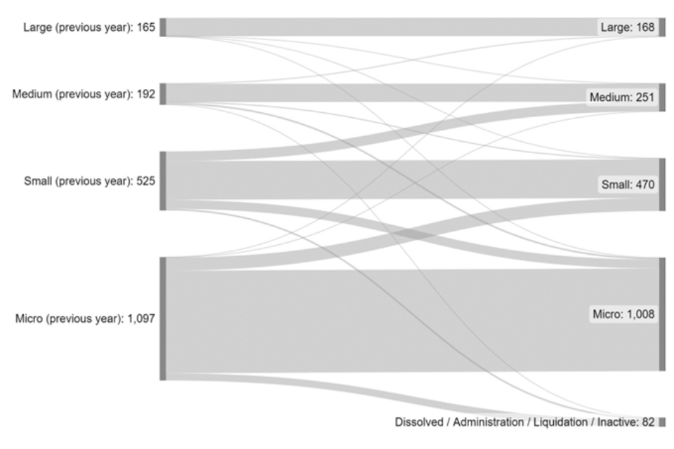Number of firms dissolved, in administration, or liquidation (82 / 1,979) = 4.1% ↩