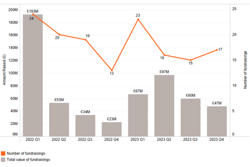 Please note that this analysis is undertaken in January 2024 (to capture full 2023 data). However, there is a caveat that Q4 data may be effectively “partial”, as this will be complete for publicly announced deals, but there is a lag for unannounced deals (i.e., deals that are made, but not announced publicly but are identified through filings with Companies House. SH01s (allotment of shares forms) are required to be submitted within one month of the transaction occurring, though it can sometimes take companies longer to file these). ↩
