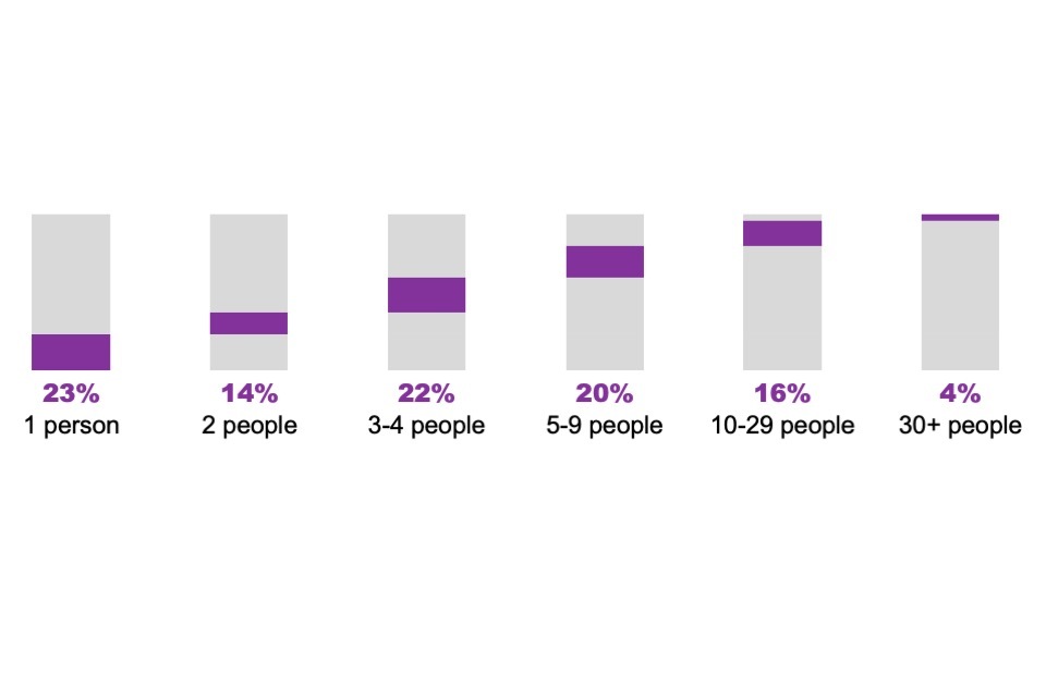 For businesses, the analysis by size split the population into micro businesses (1 to 9 employees), small businesses (10 to 49 employees), medium businesses (50 to 249 employees) and large businesses (250 employees or more).