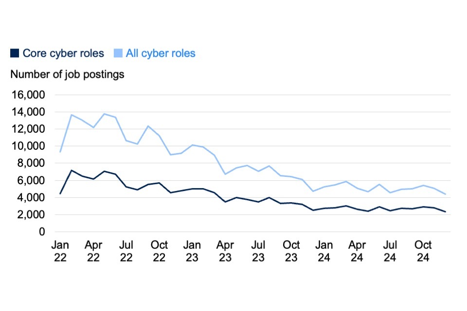 There was an average of 2,698 core cyber security job postings per month in 2024, with a median salary of £55,000. For the second year running, there was a decline in cyber security job postings, decreasing by 33% from 2023 for core cyber security roles (jobs where some aspect of cyber security is the main job function), and by 41% for all cyber security roles (roles that may not formally be labelled or commonly recognised as cyber security jobs, but still require cyber security skills).