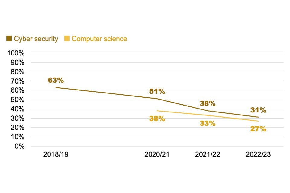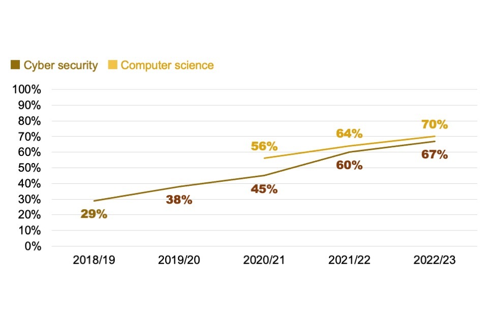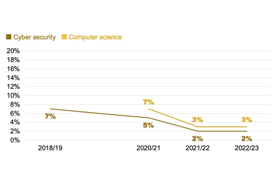 On the supply side, there was approximately 20% growth in the number of cyber security graduates between the 2021/22 and 2022/23 academic years. We therefore estimate approximately 6,000 graduates are entering the cyber security labour market each year. The number of non-UK and non-EU cyber security postgraduate students continued to rise, accounting for 67% of all cyber security postgraduate students in 2022/23, the most recent available data.