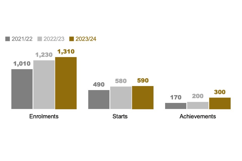 Apprenticeship enrolments are the count of enrolments at a programme level for each academic year. Learners will be counted for each apprenticeship they take. Therefore, each learner may be counted more than once. ↩