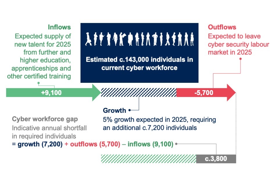 We estimate there were approximately 143,000 individuals in the UK cyber security workforce, reflecting moderately accelerated growth driven by increasing graduate numbers.