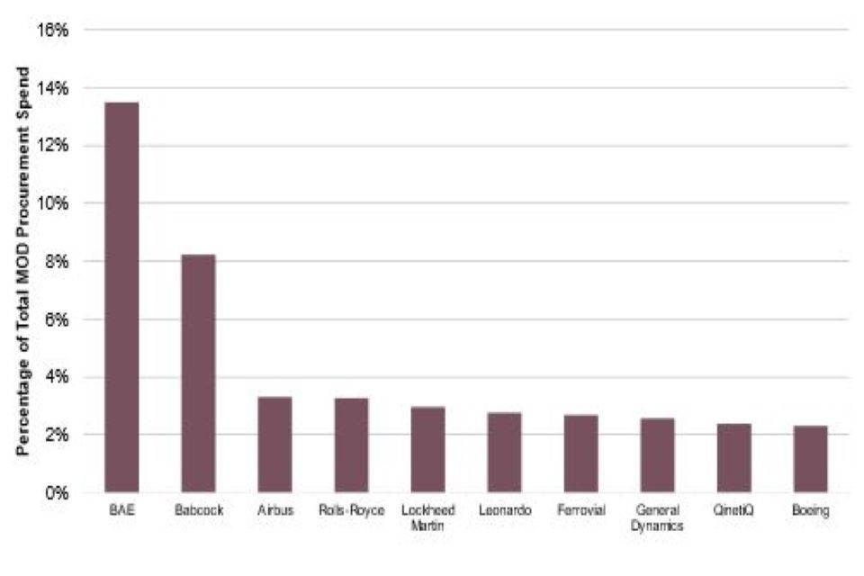 In 2019/20, MOD paid some 13,000 different suppliers, but the top fifteen suppliers accounted for around half of the total procurement expenditure (source: ‘MOD trade industry and contracts 2020’, National Statistics publication 17 September 2020). ↩