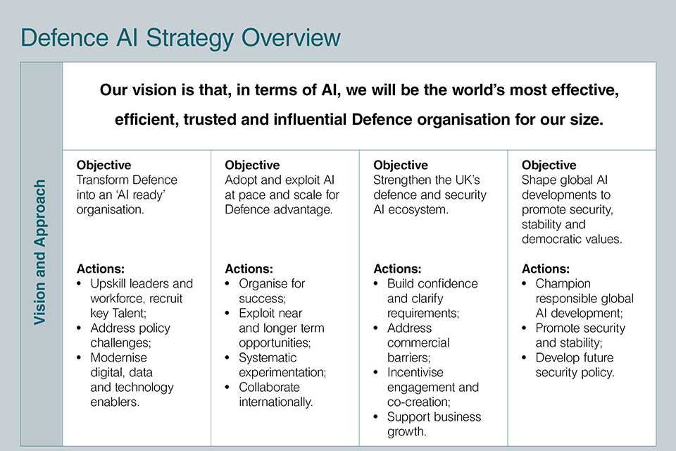 • AI must be the essential future technology for almost everything that we do. We must be ambitious, aiming to deliver world-leading AI solutions and AI-enabled capabilities.