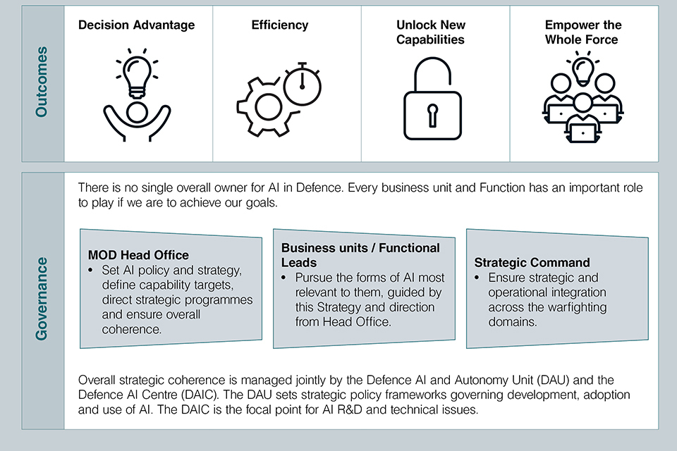 • adopt and exploit AI at pace and scale for Defence advantage, pursuing both ambitious, complex projects and simpler, iterative approaches;