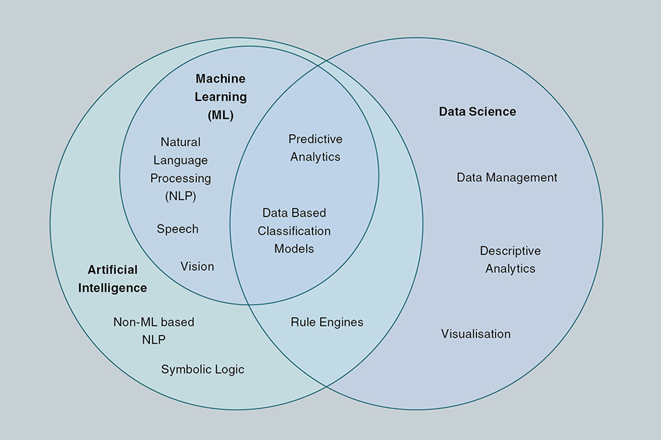 A Venn Diagram showing the 3 circles: The first is Data Science, which includes predictive analytics, data-based classification models, data management, descriptive analysis, visualisation, and rule engines, overlaps with the second: Artificial Intelligence including rule engines, non-ML based natural language processing, and symbolic logic. The third circle, Machine Learning, entirely sits inside the second circle and overlaps the first. Machine Learning includes natural language processing, speech, vision, predictive analytics, and data-based classification models.