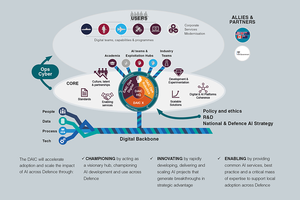 • Deliver the Defence AI Centre (DAIC) as an Initial Operating Capability, with particular emphasis on establishing effective links to industry and academia;