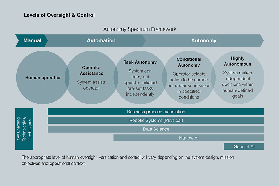 A diagram showing the Autonomy Spectrum Framework represented against a gradient from left to right: from manual, to automation, to autonomy. Starting from the left and moving right: