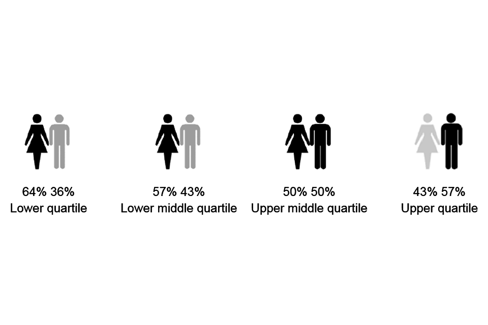 The hourly pay quartiles data show the proportion of men and women that are in each pay quartile, when we arrange staff in order of hourly pay rate. The lower quartile of staff comprises 64% female staff and the upper quartile comprises 43%.