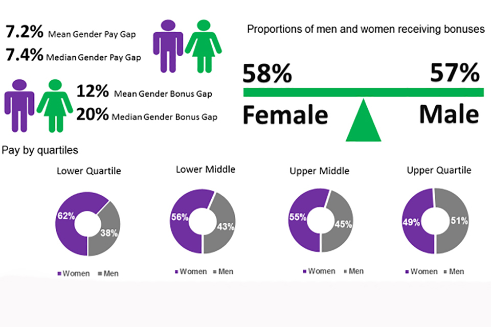 It is pleasing that both our mean (7.2%) and median (7.4%) gender pay gaps have reduced this year (reduction of 1.2% mean, 2% median), thus maintaining a continuous downward trend over the last four years. Our policies and initiatives promote equal opportunities for all our workforce and it is encouraging to see this reflected in our narrowing pay gaps.