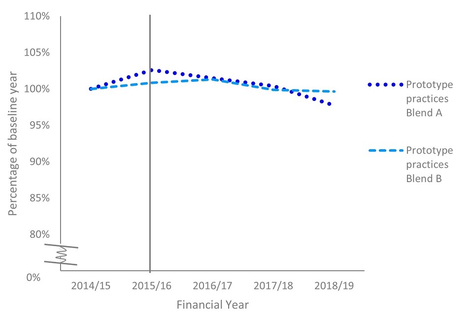 From late 2018 onwards, 36 additional practices joined the fourth wave of the prototype phase. As this report presents data between the baseline in 2014 to 2015 and the 3 financial years 2016 to 2017, 2017 to 2018 and 2018 to 2019, wave 4 was not included in this evaluation.