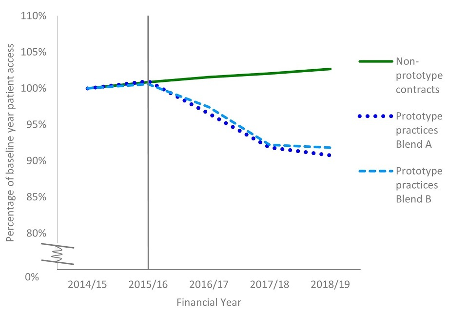 The data on access after 3 years of prototyping show that for prototype practices, there was a reduction in patients cared for to 91% of the pre-prototype baselines using a measure of 24-month unique patient access. In contrast, comparable non-prototype contracts showed an increase in the number of unique patients seen over a 24-month period over the same timeframe to 103% of financial year 2014 to 2015 figures.