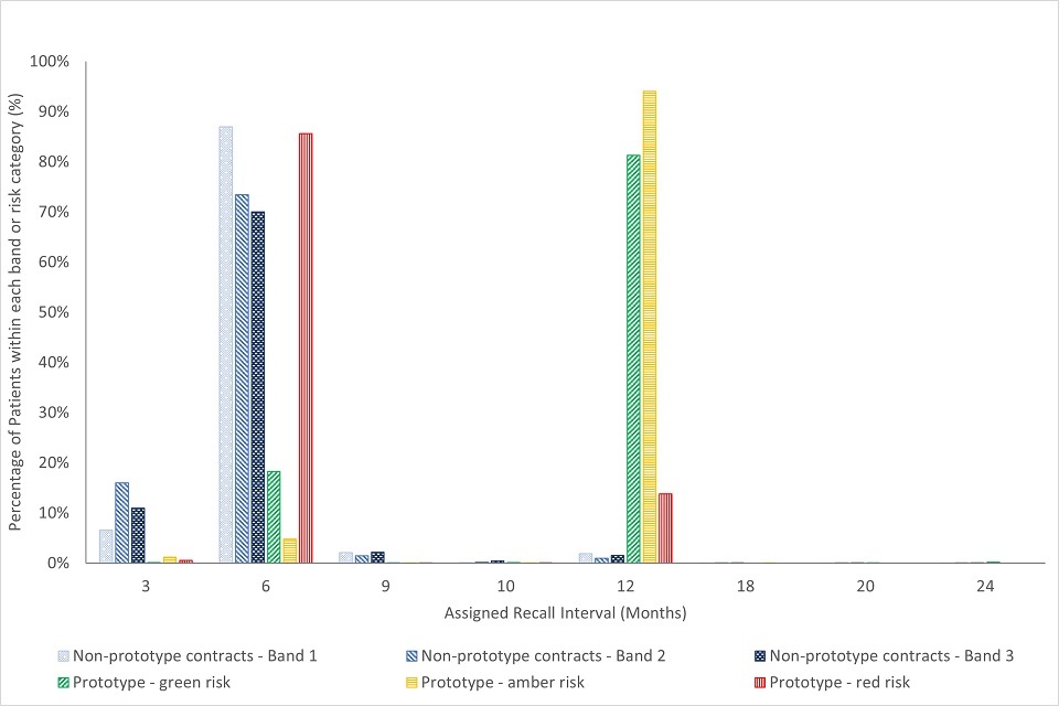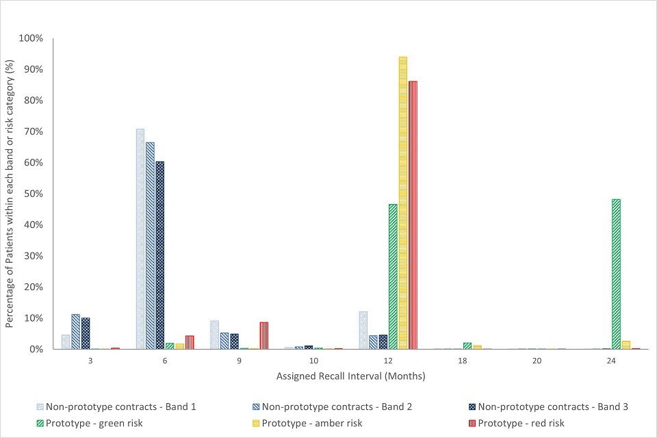 Prototype practices showed closer adherence to planned NICE recall guidelines for children and adults (with longer planned recall intervals), compared with those working under the non-prototype contract model. Both children and adults returned later for a subsequent course of treatment (a longer interval between treatments) in prototype practices, compared with non-prototype contracts.