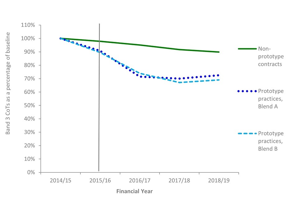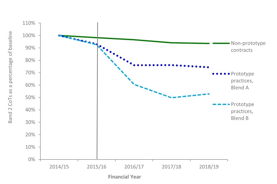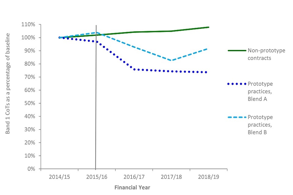 The number of courses of treatment in all treatment bands at prototype practices reduced from the baseline year to 46% of urgent, 82% of band 1, 64% of band 2 and 71% of band 3 courses of treatment. During the same period, non-prototype contracts saw an increase in band 1 courses of treatment to 108% of financial year 2014 to 2015 levels, and a decrease in urgent (to 98%), band 2 (to 94%) and band 3 (to 90%).