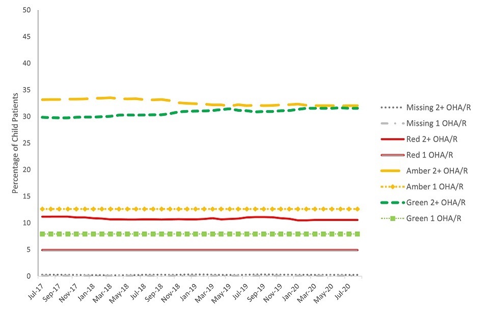 The pathway started with an OHA assessment of a patients’ risk for oral disease. Patients were assigned a red, amber or green (RAG) rating based on social and medical history factors, along with their clinical examination findings on 4 domains: