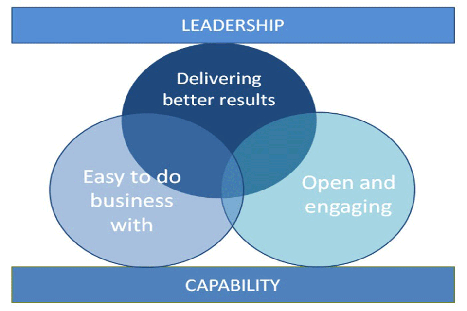 This diagram represents the importance of leadership and staff capability in achieving the 3 elements of our strategy.