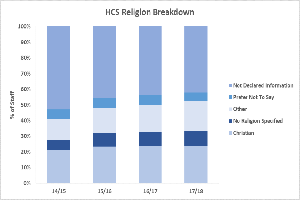 In the British Social Attitudes survey of 2016, 41.0% of the population described themselves as being Christian. The declaration rate for religion within DFID is 58.0%, and of the declared population, 40.6% identify as being Christian. Given the large number of religious groups it is still not possible to undertake detailed analysis based on religion without first achieving higher declaration rates.