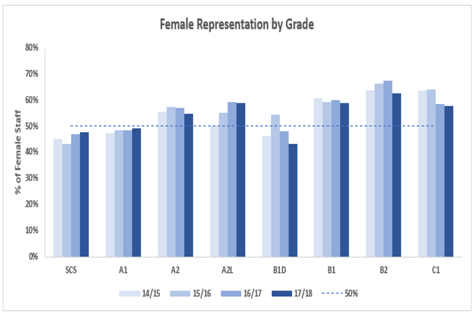In 2017/18, 55.4% of DFID’s workforce was female, a slight fall from 2016/17, though slightly higher than the Civil Service figure of 53.8%.