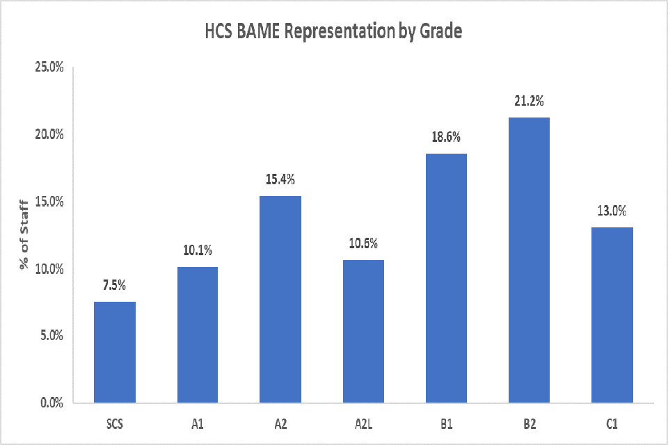 The percentage of Black, Asian and Minority Ethnic (BAME) staff in the Civil Service was 12.0% in March 2018. The level of BAME representation in DFID is slightly higher at 14.4%, based on those staff that have provided this data. UK Census data from 2011 showed that 13.4% of the UK working age population were BAME.