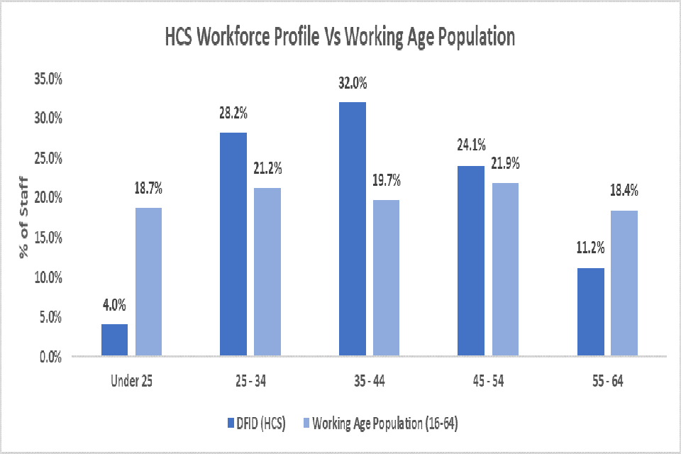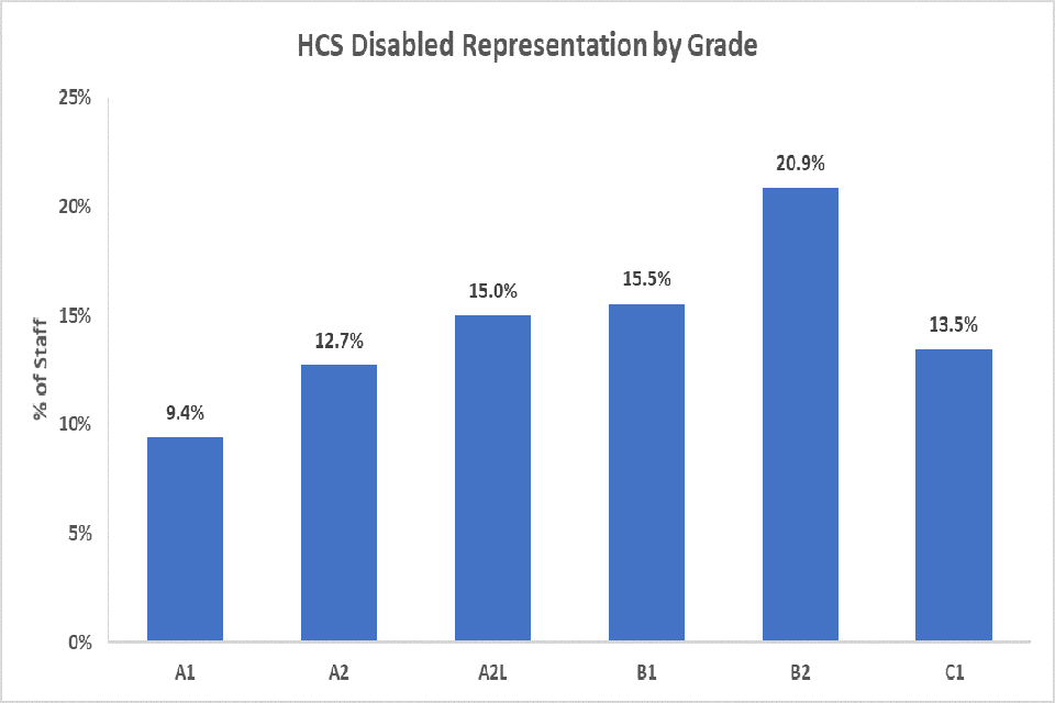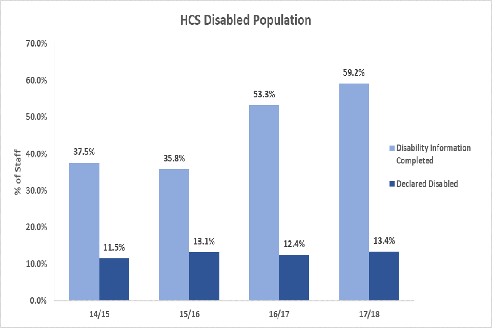 The percentage of HCS staff in DFID who have declared themselves as having a disability is at 13.4%, higher than the overall Civil Service figure (correct at 31/3/2018) of 10.0% and the latest available wider UK figure for working age adults for 2016/17 which is 19.0%.