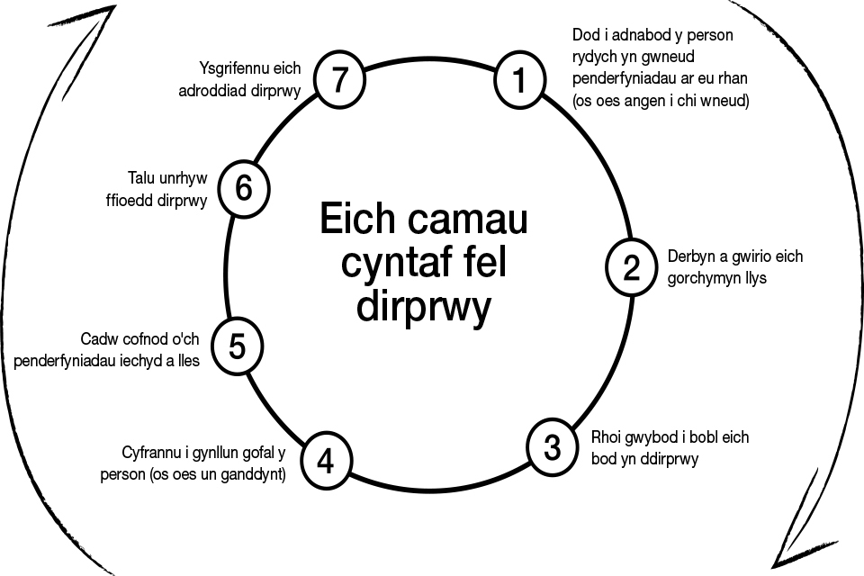 Os yw hyn oll yn newydd i chi ac yn teimlo braidd yn llethol, peidiwch gofido, dydych chi ddim ar eich pen eich hun. Os ydych angen cymorth wrth wneud penderfyniad, trafodwch hyn gyda’ch rheolwr achos yn yr OPG neu’r gweithiwr gofal neu aelod o deulu’r person yr ydych yn gwneud penderfyniadau ar ei rhan/ran.