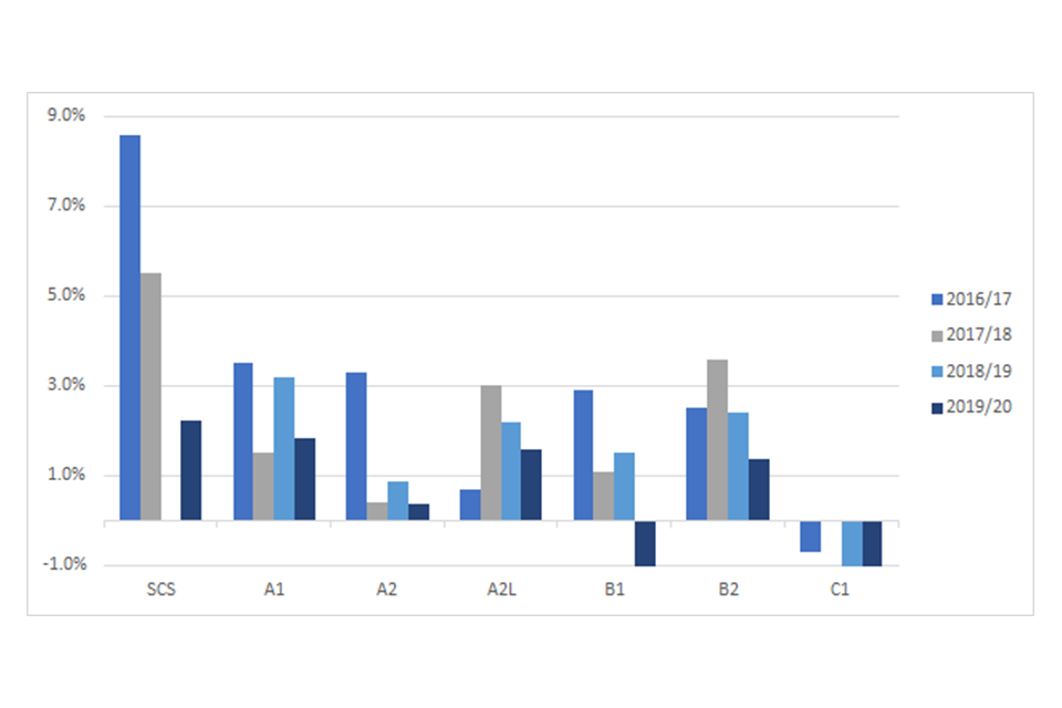 The mean gender pay gap in SCS grade has decreased significantly from 8.6% in 2016/17 and is now sitting at 2.2%, although there has been an increase from 0% in 2018/19. Within other pay grades it has fluctuated across years, however only grade A2L remains higher than 2016/17 level.