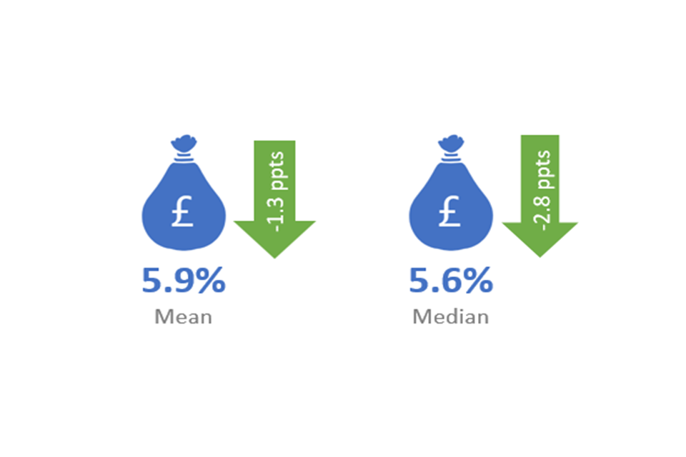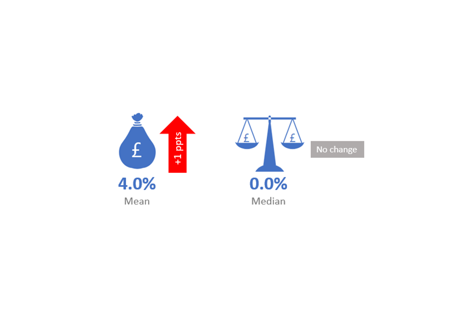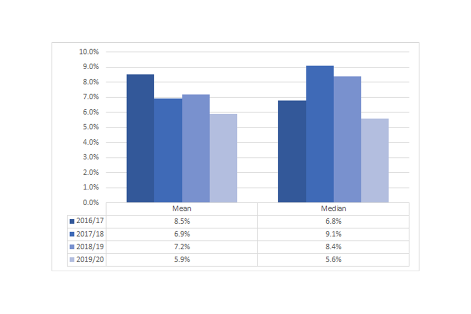 The mean pay gap has decreased by 1.3 percentage points between 2019 and 2020 and the median pay gap has decreased by 2.8 percentage points from 2018/19.