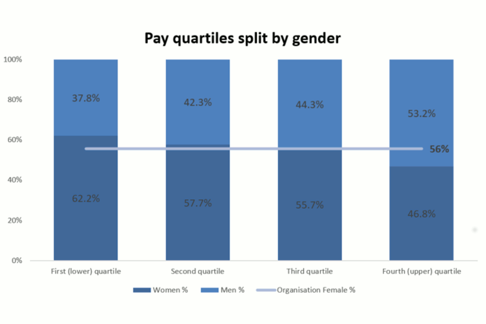 Overall this is reflected in our pay quartiles which shows a greater proportion of women in the lower quartile (62.2%) than in the higher quartile (46.8%).