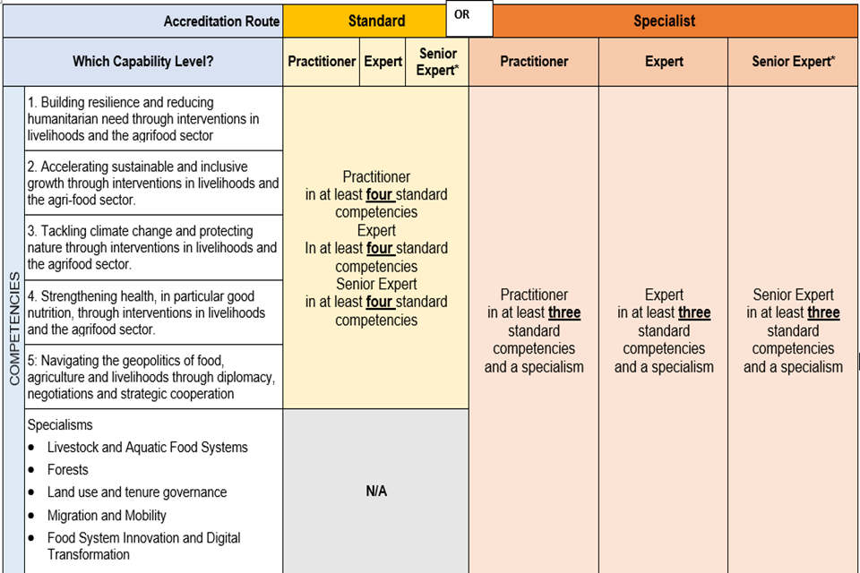 Those accredited at Senior Expert, Expert or Practitioner are considered to be accredited to the Food and Agriculture cadre.