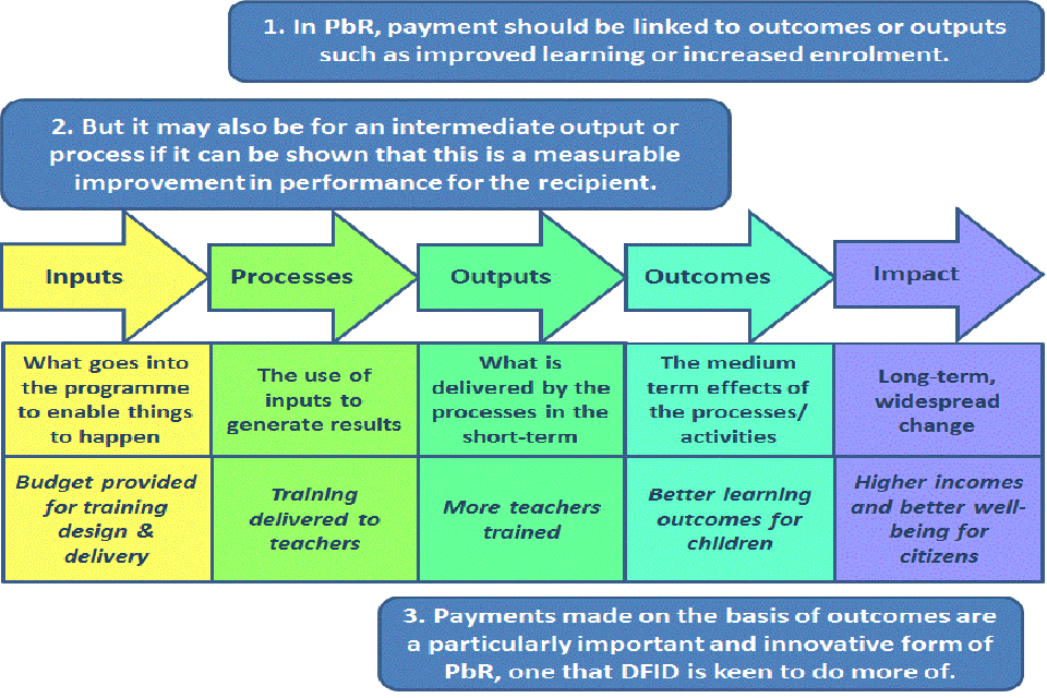 DFID does not stipulate the type of organisation we work with or a minimum amount of payment on delivery, but an intervention will only be regarded as Payment by Results if payments are made for pre-agreed results, rather than inputs. Development is a complex process and what constitutes a “result” will vary according to context. To count as Payment by Results, payments have to be for measurable improvements in performance. The results chain is illustrated in Figure 1 below, using examples from the education sector [footnote 3].