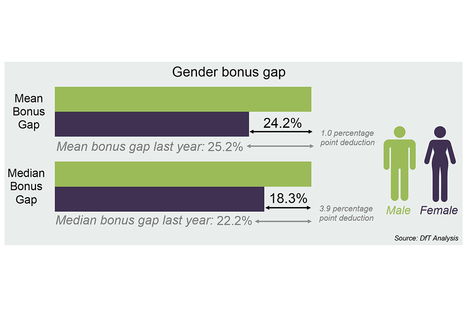 The mean bonus gap payment between male and female employees in DfT and its agencies is 24.2% which is a 1.0% reduction on last year. The median bonus payment gap between male and female employees is 18.3% which is a 3.9% reduction.