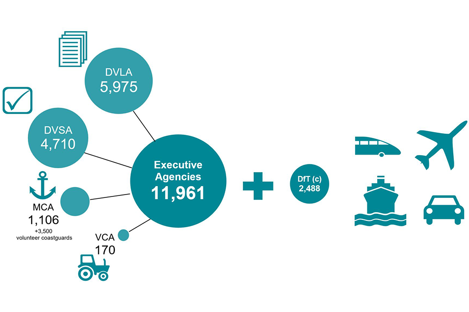 The DfT family is DfT central - 2,488 staff, includes the Accident Investigation Branches, OLEV and the Government Car Service plus the Executive Agencies (11,961 staff). DVLA (5,975 staff), DVSA (4,710) MCA (1,106) VCA (170).