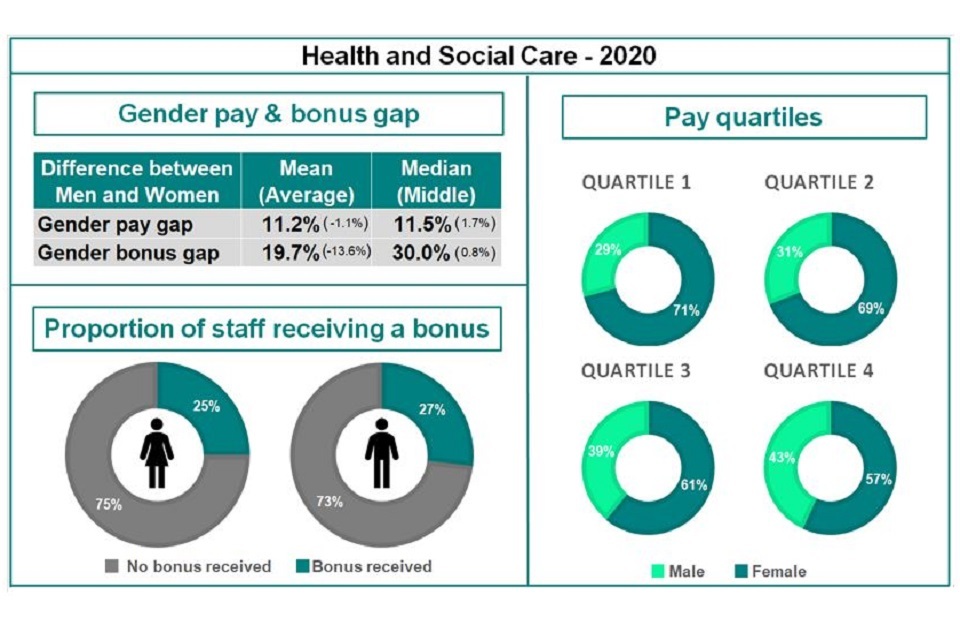 2020 Health and Social Care gender pay/bonus gap figures, showing reductions of the mean pay/bonus gaps, and increased median pay/bonus gaps. Full data can be found in ‘Table C – Gender Pay Gap Statistics’ at Civil Service statistics: 2020.