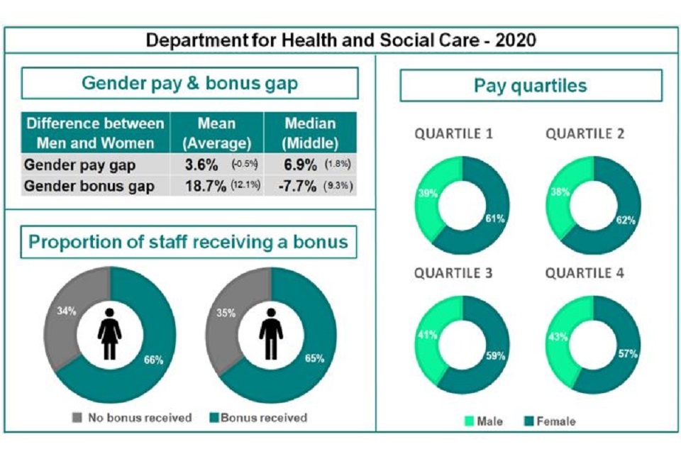 2020 Department of Health and Social Care gender pay/bonus gap figures, showing reductions of the mean pay, and increased median pay/bonus gaps and mean bonus gap. Full data can be found in ‘Table C – Gender Pay Gap Statistics’ at Civil Service statistics: 2020.