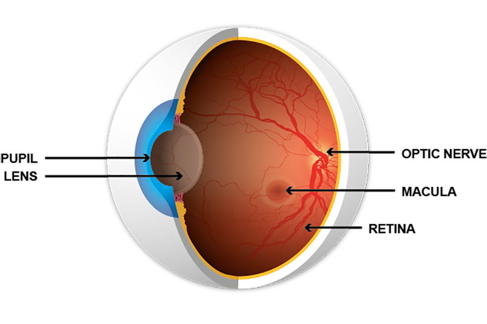 Secțiune transversală a unui ochi sănătos, care ilustrează pupila, lentila, nervul optic, macula și retina