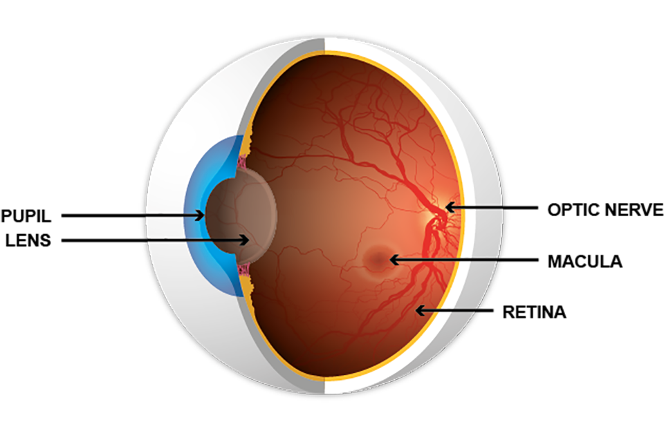 Cross-section of a healthy eye, showing pupil, lens, optic nerve, macula and retina