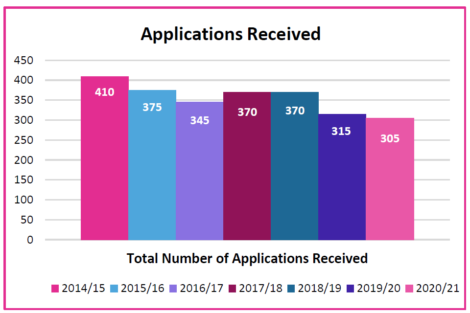 In the year 1 April 2020 to 31 March 2021, 305 applications have been received. This is approximately 3% fewer than in 2019 to 2020.