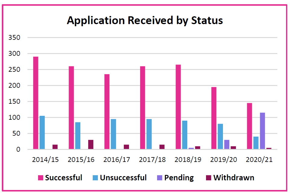 305 applications were received between April 2020 and March 2021. Decisions were made on 190 of these applications by the end of March 2021 of which 145 were successful, 40 were unsuccessful and 5 were withdrawn. In respect of the 40 unsuccessful applications, less than 5 applicants requested a review (equivalent to 5%) and all reviewed decisions resulted in the same outcome.
