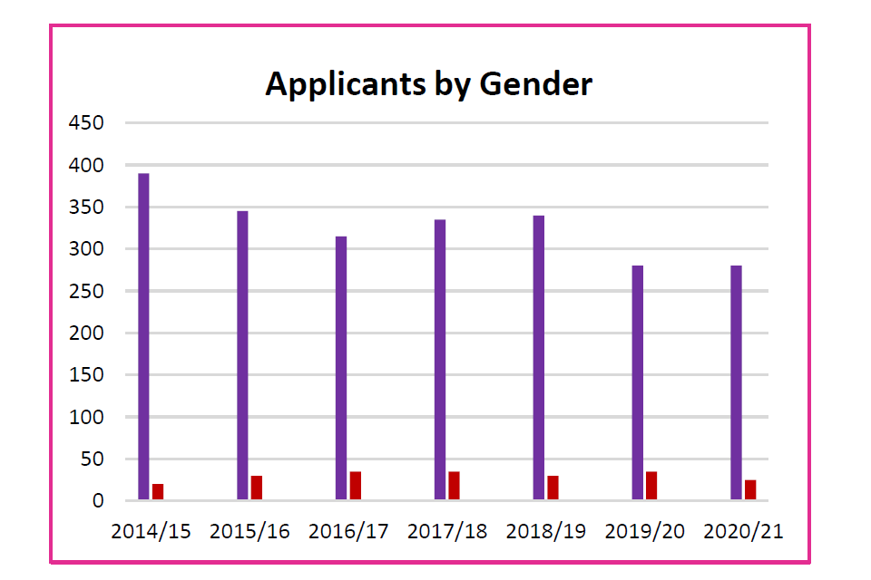 In 2020 to 2021, the percentage of female applicants decreased to 8%. This was down from the previous highest percentage of 11% in 2019 to 2020.