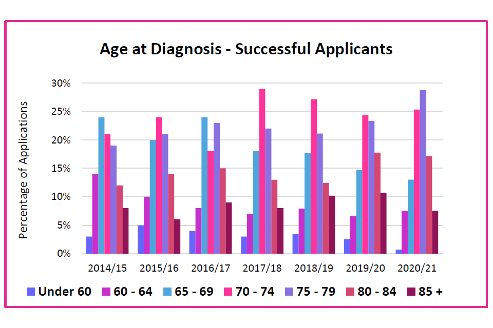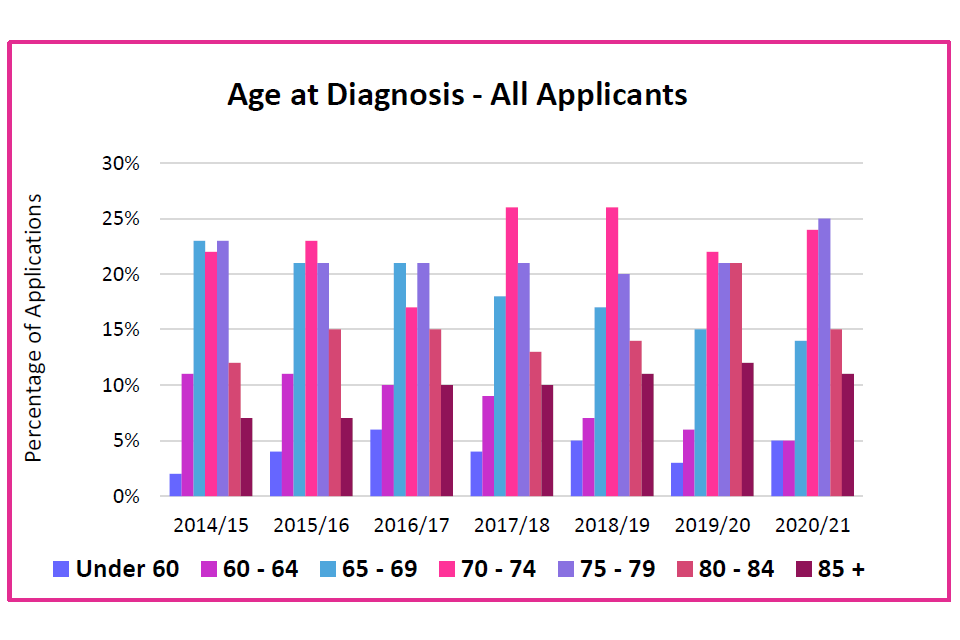 There are no age restrictions on applicants, but the potential award amount depends on the age of the applicant at the date they were diagnosed. The 12 months to 31 March 2021 saw a proportionate decrease in applications received from those in the 80 to 84 age range from 21% in 2018 to 2019 to 15%.