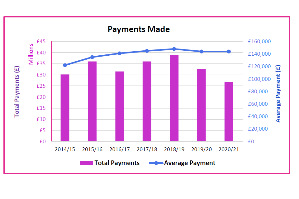 The average (mean) payment made to successful applicants in the 12 months to March 2021 was £144,000 and was the same as the average (mean) payment in the 12 months to March 2020.