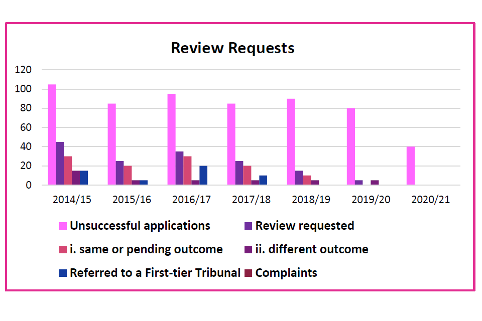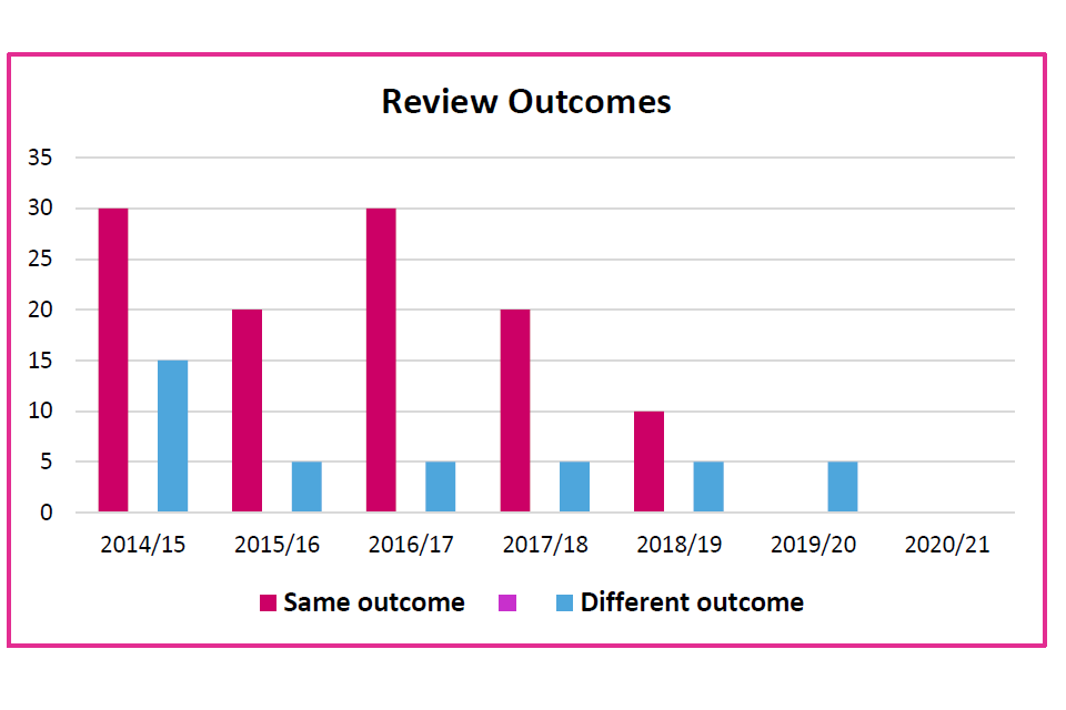 In 2020 to 2021, no review decisions were appealed to the FTT and in 2019 to 2020, fewer than 5 review decisions were appealed to the FTT. There has been one appeal to the UTT since 2019 to 2020 and the appeal was unsuccessful.